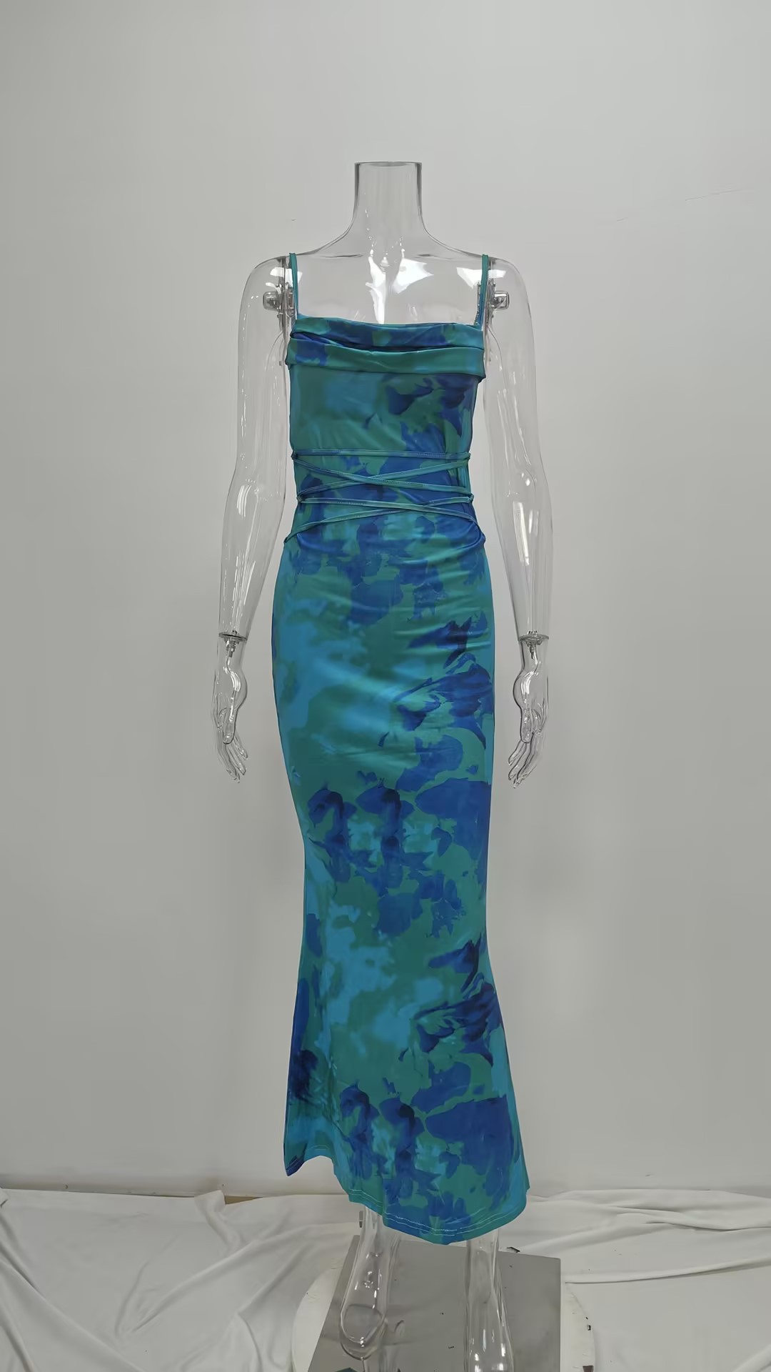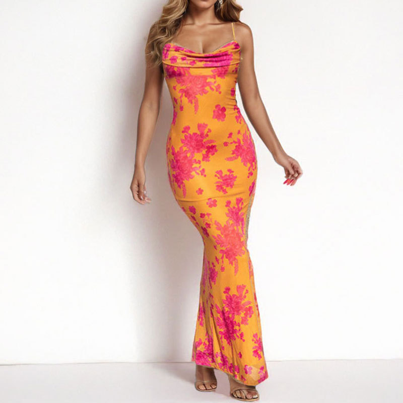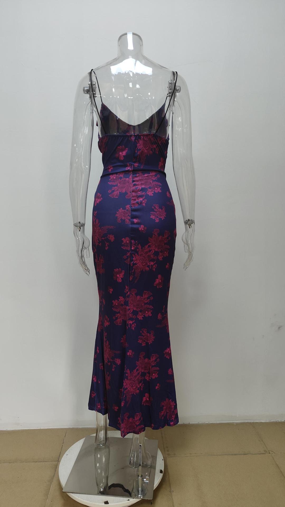 Printed strap waist cinching sexy bag buttocks long suspender dress for women
